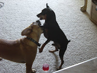 Jack, a Min Pin, is completely opposite. He's sweet, but sooo high strung. He barks like crazy at people and dogs he doesn't know. When there aren't any other dogs around, he loves to cuddle and give hugs and kisses. As soon as I brought Sam into the house...things went crazy.